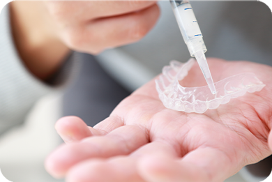 当院では、ご自宅でお好きな時間にできる「ホームホワイトニング」を取り扱っています。当院にて歯型に合わせたマウスピースを作り、ご自宅で専用のホワイトニング剤を流し込んで毎日2時間ほど装着していただきます。低濃度の薬剤を時間をかけて歯の内部まで染み込ませるため、他のホワイトニング方法に比べて白さが長持ちするのが特徴です。